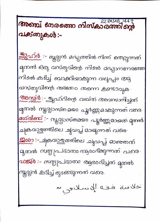 അഞ്ച് നേരത്തെ നിസ്കാരത്തിൻ വക്ക്ത്തുകൾ