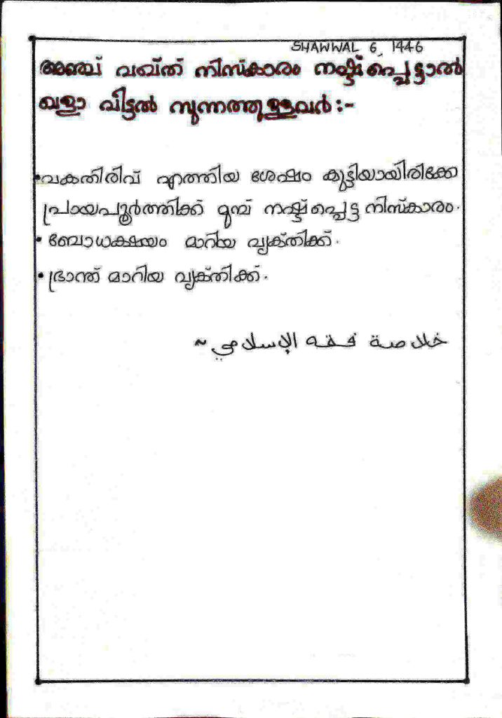 അഞ്ച് നേരത്തെ ഫര്‍ളു നഷ്ടപ്പെട്ടാല്‍ സുന്നത്തുള്ളവ