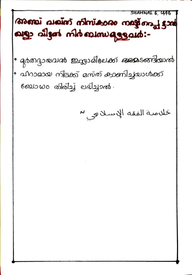 ⟵ അഞ്ച് നേരത്തെ ഫര്‍ളു നിസ്കാരം നഷ്ടപ്പെട്ടാല്‍ ഖളാ വീട്ടല്‍ ഹറാം ഉള്ളവര്‍