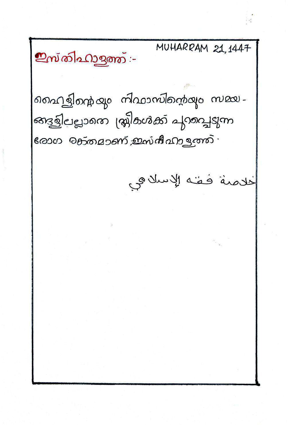 Uncategorized ഇസ്തിഹാളത്ത് Fathima Zahra BahiraJuly 17, 2025October 20, 2025 ഇസ്തിഹാളത്ത് ഇസ്തിഹാളത്ത് ആകുന്ന രൂപങ്ങൾ
