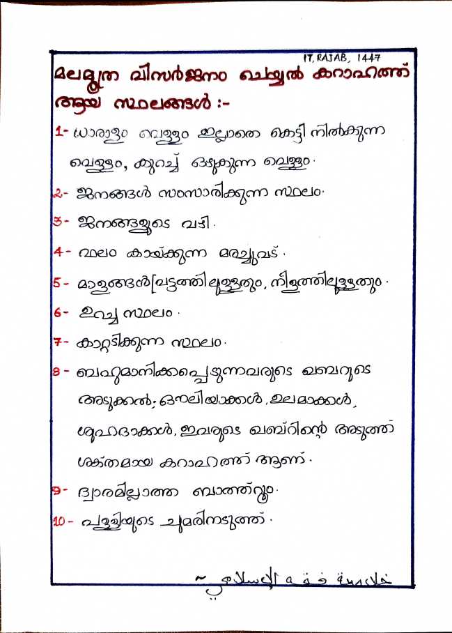 മലമൂത്ര വിസര്‍ജ്ജനം ചെയ്താൽ കറാഹത്ത് ആകുന്ന സ്ഥലങ്ങള്‍